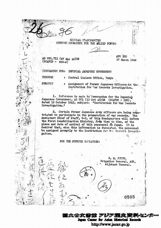 The GHQ order, “Institution for War Records Investigation” (SCAPIN-126), was sent to the Japanese government, instructing the gathering of records related the Pacific War (Tanaka 2009, p372).