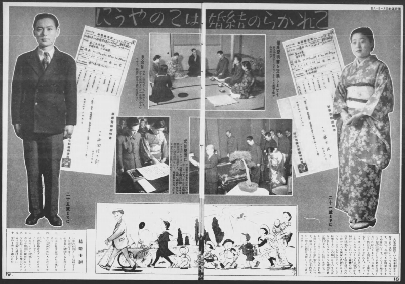 「人口の増加を図るには、まづ出生数を増加する必要がある。出生の増加を図るには、まづ結婚を促進する必要がある」(安井洋『結婚新道』広文堂、1942年、6頁)ということで、国を挙げての結婚奨励が行われるようになったのです。