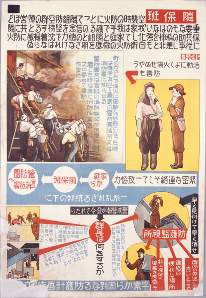 「私たちはみ国を護る戦士です、いのちを投げ出して持場を護ります」という「防空座右銘」のもとに町内の一致団結がはかられ、「全都市の家庭が一燈たりともゆるがせにせぬよう」灯火管制にあたり、爆撃の際は消火につとめるように求められました。