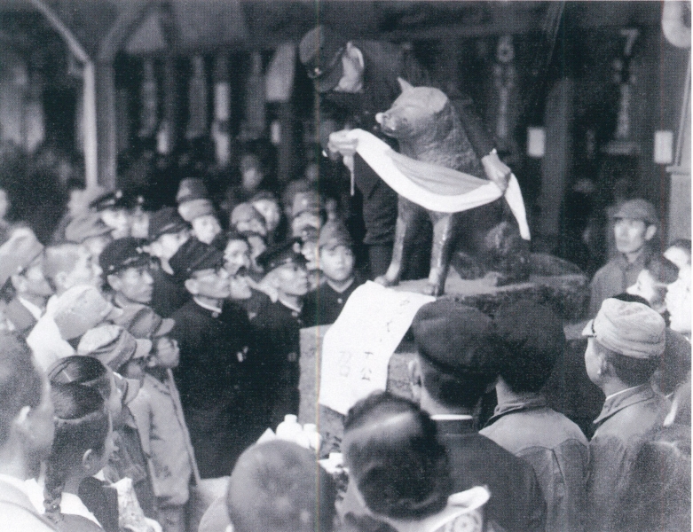 タンスの取手や窓の格子、ネクタイピンに至るまで、ありとあらゆる日本全国の金属類が回収される中、多くの反対や抗議がありましたが、1944(昭和19)年10月にハチ公像もついに供出されることになり「出陣式」がおこなわれました(画像1)。