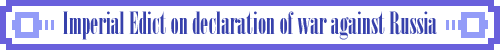 We, by the Grace of Heaven, Emperor of Japan, seated on the Throne occupied by a line of Emperor's unbroken for age eternal, do hereby make proclamation to all Our loyal and brave subjects as follows: We hereby declare war against Russia and We command Our army and navy to carry on hostilities against Russia with all their strength, and We also command all Our competent authorities to make every effort in pursuance of their duties, and in accordance with their powers, to attain the national cause with all the means within the limits of the law of nations. We have always deemed it essential to international relations and made it Our constant aim to promote the pacific progress of Our Empire in civilization, to strengthen Our friendly ties with other states, and to establish a state of things which would maintain enduring peace in the East Asia and assure the future security of Our Empire without injury to the rights and interests of other powers. This is what We have emphasized when negotiating with other countries, and We have always endeavored not to violate this thought. Our competent authorities have also performed their duties in obedience to Our will, so that Our relations with the Powers have been steadily growing cordiality. It was thus entirely against Our expectation that We have unhappily come to open hostilities against Russia. The integrity of Korea is a matter of constant concern to Our Empire. It is not only because of Our traditional relations with that country, but because the independence of Korea is essential to the safety of Our realm. Nevertheless, Russia, in disregard of her solemn treaty pledges to China, her repeated assurances to other Powers, is till in occupation of Manchuria and has consolidated and strengthened her hold upon three provinces, and is bent upon their final annexation. And since the absorption of Manchuria by Russia would render it impossible to maintain the integrity of Korea and would in addition compel the abandonment of all hope for peace in the Far East. We determined in those circumstances to settle the question by negotiation, and to secure thereby permanent peace. With that object in view, Our competent authorities, by Our order, made proposals to Russia, and frequent conferences were held during the course of six months. Russia, however, never met such proposals in a spirit of conciliation. But by her wanton delays Russia put off the settlement of the question and by ostensibly advocating peace on the one hand while she was on the other extending her naval and military preparations, sought to make us succumb to Russia. We cannot in the least admit that Russia had from the first any serious or genuine desire for peace. She has rejected the proposals of Our Government; the safety of Korea is in danger, the vital interests of Our Empire are menaced. The guarantees for the future which We have failed to secure by peaceful negotiations We can only now seek by an appeal to arms. It is Our earnest wish that by the loyalty and valor of Our faithful subjects, peace may soon be permanently restored and the glory of Our Empire preserved. (The Imperial sign manual and seal) |