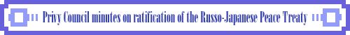 | The Council, I presume, is aware that, prior to the peace talks, the Cabinet had fully deliberated our position, and, with the Emperor’s authorization, gave detailed instructions to the full powered Delegation. We submit that the Delegation, under instructions from the Emperor, did its utmost best vis-a-vis its counterpart to bring the negotiation to a conclusion. Yet, this treaty has aroused much controversy among the public who are widely divided on the issue. I believe that we must calmly assess the situation since the opening of the war. In taking a decision for the Emperor on the ratification of the treaty, we must ensure that any cause for concern is removed and that he may rest at ease. |