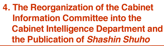 The Cabinet Information Committee, which was officially established in 1936, was reorganized into the Cabinet Intelligence Department on September 24, 1937. In addition to “liaising and coordinating” the information operations the Cabinet Information Committee had undertaken, through this reorganization the Cabinet Intelligence Department was also entrusted with the added responsibilities of “gathering information not belonging to other government organizations, reporting, and conducting awareness-raising campaigns and publicity activities.”
