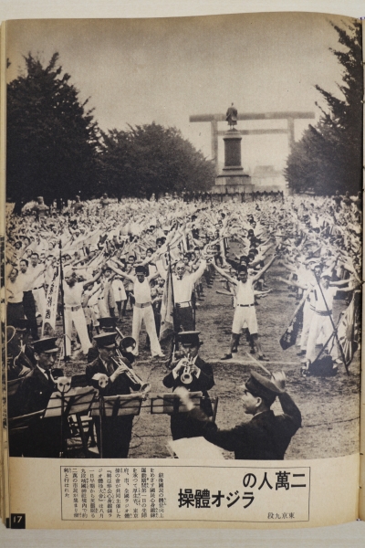 様々な儀式や大会に合わせて大規模なラジオ体操の会が開かれるようになりますが、そこでは国旗掲揚や国歌斉唱、宮城遥拝とラジオ体操が連続して進行されました。
