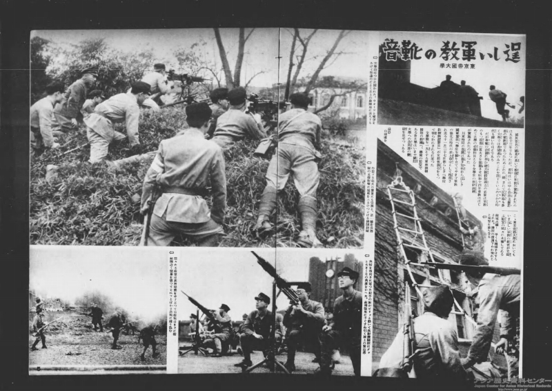 画像1 東京帝国大学における軍事教練、1941年(『写真週報』198号、Ref.A06031079300、1-3画像目)
