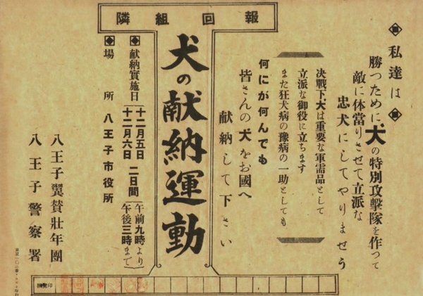 さて、全国的な皮革不足のなか、1944(昭和19)年に軍需省化学局長と厚生省衛生局長の連名による通牒が全国の地方長官(知事)へ出され、通達された「犬原皮増産確保並狂犬病根絶対策要綱」に基づいて、軍用犬・警察犬や登録されている猟犬、天然記念物の指定をうけた日本犬を除いた畜犬は、献納もしくは供出買上することになりました。[西田秀子2016]