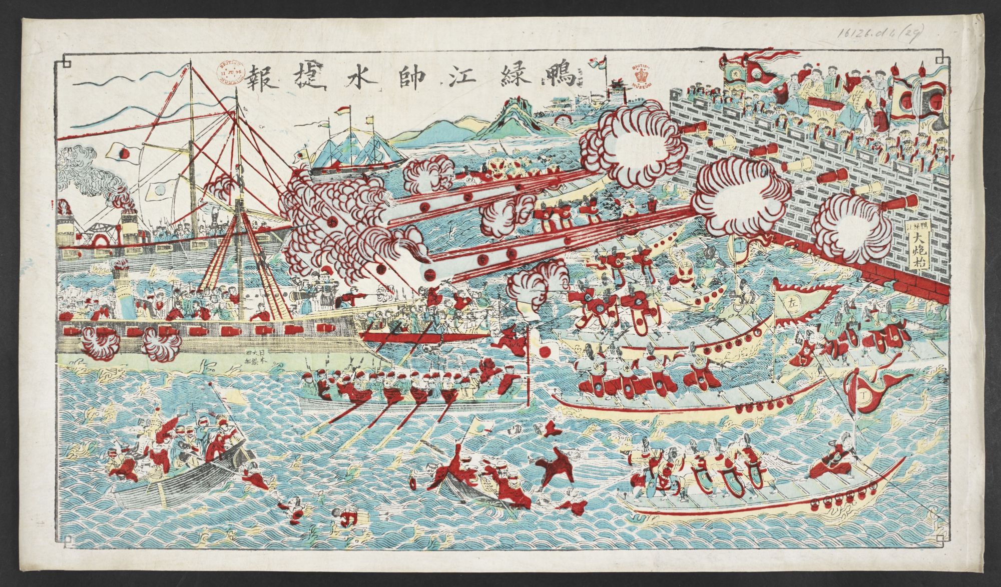 - 明治27年(1894年)9月17日、日本艦隊(連合艦隊)と清国艦隊(北洋艦隊)が黄海の鴨緑江沖(大孤山沖と書かれることもあります)で遭遇し戦闘が起きました。この戦闘では日清双方で大きな損害を出しましたが、特に清国艦隊は失った艦船や乗組員の数が大きなものとなりました。ここでは、清国軍が日本艦隊に対して陸上から砲撃を行っている様子が描かれています(実際の黄海海戦では清国軍が日本艦隊に対して陸上から砲撃を行ったことはありません)。