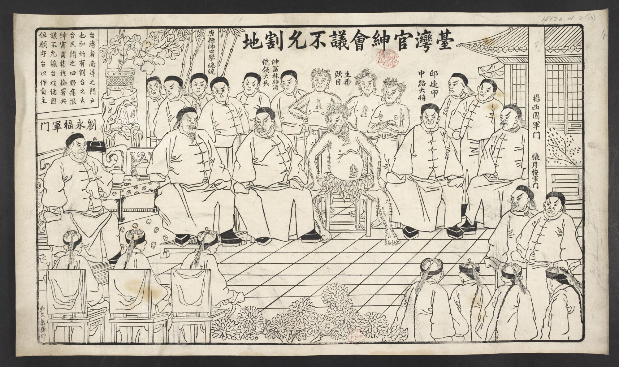 - 明治28年(1895年)5月29日、日清講和条約に従って清国から台湾の割譲を受けこれを平定するために、初代台湾総督となった樺山資紀海軍大将率いる日本軍が台湾島の最東北部に上陸しました。これ以降、割譲に反対する清国や台湾の人々と日本軍との間で、いわゆる台湾征服戦争(乙未戦争)が繰り広げられることになります。ここでは、台湾の割譲に反発する人々が樹立した台湾民主国の唐景崧総統や劉永福大将軍といった清国政府の官僚・軍人らと台湾先住民のリーダーたちが、台湾の割譲に反対することで合意している様子が描かれています。