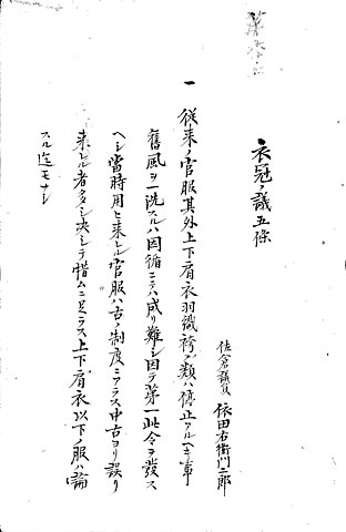 - (5)は、佐倉(現千葉県)の依田右衛門二郎(漢学者・依田学海か)が提出した「衣冠ノ議五条」(年代不詳)という建白書です。依田は、「従来ノ官服其外上下肩衣羽織袴ノ類」(江戸時代の武士の礼装など)を廃止すべきと主張し、そのような官服(官吏が着ている制服)は「古ノ制度」ではなく「中古ヨリ誤リ来レル者」が多いので、惜しむべきものではないとしています。そして、官服には、「烏帽子(えぼし)」と「鎧直垂(よろいひたたれ)」(鎧の下に着る直垂)という平安時代に由来する服装とともに、舶来品を含めた革靴を提案しています。革靴をはじめ、紙か絹製の軽い「烏帽子」と動きやすい「鎧直垂」という選択から、依田の機能性を重視する姿勢がうかがえます。また、服の色については「古ニ復シテ、上下貴賎ヲ別ツ事」として、「隋唐ノ制ニ倣」った古代のそれに戻すべきとしています。