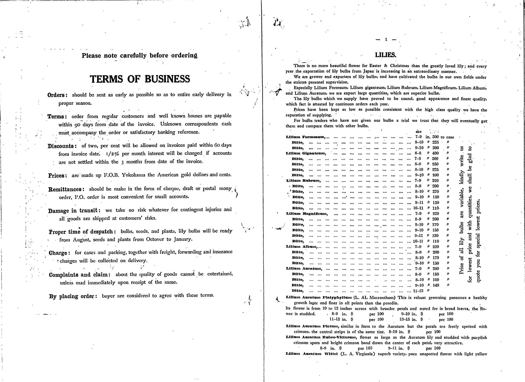 中を開けると、まずユリ(Lilies)の項目があり、その冒頭には「イースターやクリスマス用の花として、広く愛されているユリほど美しい花はありません」と書かれています。欧米諸国でこれらの行事の時に飾りつける花の一つとして、日本のユリが使われていたことがわかります。 続いて具体的な品種名が挙げられます。輸出量の多い品種としては、Lilium formosum(タカサゴユリ)、Lilium Auratum(ヤマユリ)、Lilium Magnificum(シロカノコユリの変種)など6種類が挙げられ、それぞれについてサイズと1ケースあたりの価格が書かれています(14)。ただ価格については変動が大きいことと、購入側からの価格提示によって最低価格を見積もることが脇に注記されています。 さらに、その他の全36種類については花の特徴が記されています。たとえばLilium Concolor(ヒメユリ)については「上を向いて咲く星形の花で、直径はおよそ2インチ。洋紅色で黒い斑点がある」と書かれています(15)。