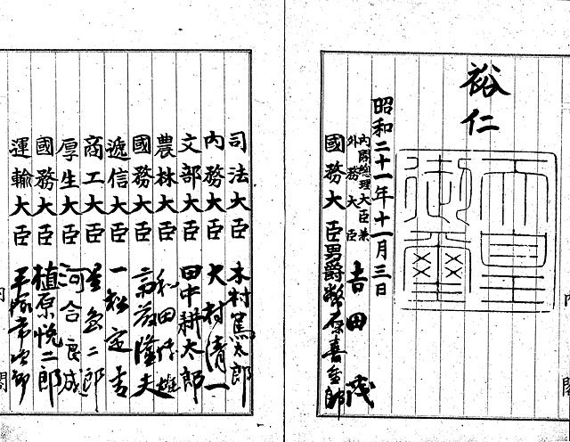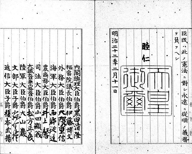 まず、国内法の代表として、国家が守らなければならない最高法規としての憲法があります。開国後の日本では、まず明治22年(1889年)に「大日本帝国憲法」が発布されました。 (1) には、大日本帝国憲法発布の際の明治天皇の署名(「睦仁」と記されています)と印(「天皇御璽」とあります)、さらには各大臣の副署があります。伊藤博文、大隈重信、西郷従道、大山巌といった人々も名を連ねています。