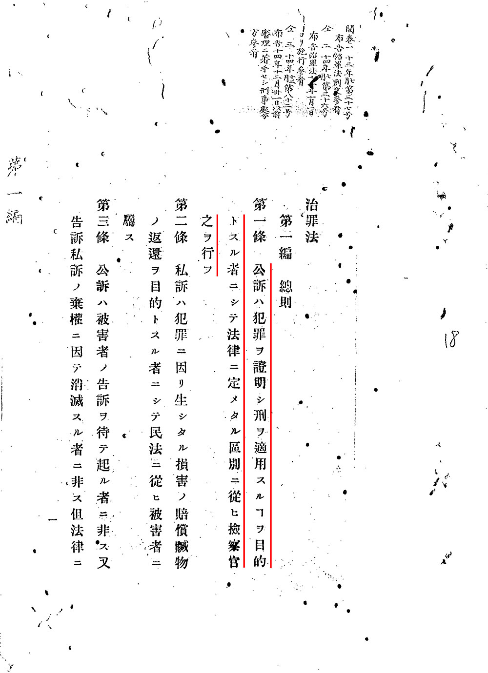 また、このような憲法のもと、国家が国内の治安を維持し、また犯罪者を更生させるために科す刑罰について、国家が勝手に国民を処罰できないように、何が犯罪になるのかを明確に表した刑法が制定されました。また、刑法で定められた犯罪を捜査したり裁判したりする時も、自白を強要するような捜査があってはいけませんし、裁判でも無罪の可能性があるのに有罪にしてしまうことは許されません。これらを防ぐため、近代国家では刑事訴訟法が制定されました。アジ歴には、明治13年(1880年)に発布された、今の刑事訴訟法の前身にあたる治罪法があります。(6) によれば、その第一編第一条には「公訴は犯罪を証明し刑を適用する事を目的とする者にして法律に定めたる区別に従い検察官之を行ふ」と定められています(原文カナ旧字)。この「公訴」とは、今で言う刑事裁判のことです。