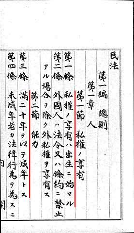 一方、国民が自由に行う経済活動や、家族に関することには国家が介入しないことが望まれます。自由な国民同士の関係を規律することで国民の活動が円滑に進むようにし、また国家の介入を許さないようにすることを目的とした民法も制定されました。民法の制定にあたっては一波乱あったことがよく知られています。当初はフランスの民法を参考にしたボアソナード草案が採用されるはずでしたが、民法の施行によって家制度など日本の伝統的な文化が廃れるという危機感が広がり、結局ボアソナード草案は施行されることなく終わってしまいました。現在の民法は、明治29年(1897年)に公布、翌年に施行されたものですが、(7) がその「民法第一編第二編第三編」の内容です。第一章には「第一条 私権の享受は出生に始まる」と定められています(原文カナ旧字)。また、「第三条」には「満二十年を以って成年とす」と規定されています。