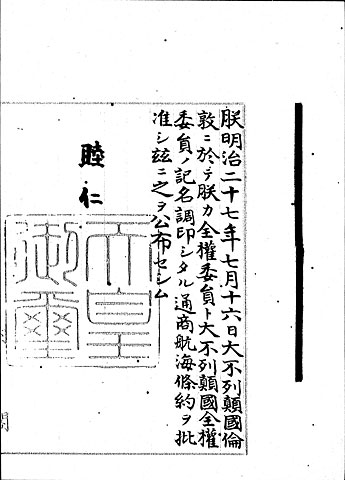 (8) は、明治25年(1892年)7月14日にポルトガルの領事裁判権の廃止が決定された際の明治天皇による御署名原本です。萬延元年(1860年)に江戸幕府が葡萄牙政府(ポルトガル政府)と締結した条約の中の「領事裁判権に関する条款無効の件を裁可し茲(ここ)に之(これ)を公布せしむ」と定めています(原文カナ旧字)。これによって、以降は日本にいるポルトガル人は日本の法律によって裁かれることになりました。