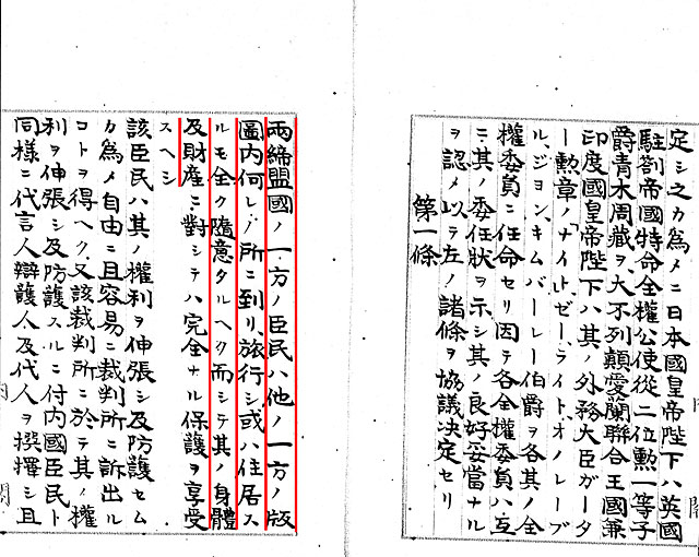 (9) は、日本が「大不列顛国」との間に結んだ通商航海条約の条文です。この「大不列顛国」とは「グレートブリテン」、つまり今日のイギリスを指します。この「通商航海条約」とは、その条約を結ぶ国々の間での人や物が往来する際のルールを取り決めたものです。(10) には日本と「大不列顛国」との通商航海条約の「第一條」として「両締盟国の一方の臣民は他の一方の版図内何れの所に到り、旅行し或は住居するも全く随意たるへく而して其の身体及財産に対しては完全なる保護を享受すへし」とあります(原文カナ旧字)。これは、日本人とイギリス人はお互いの国に旅行したり住んだりできます、という意味です。