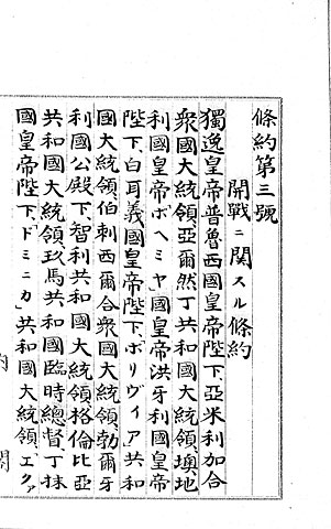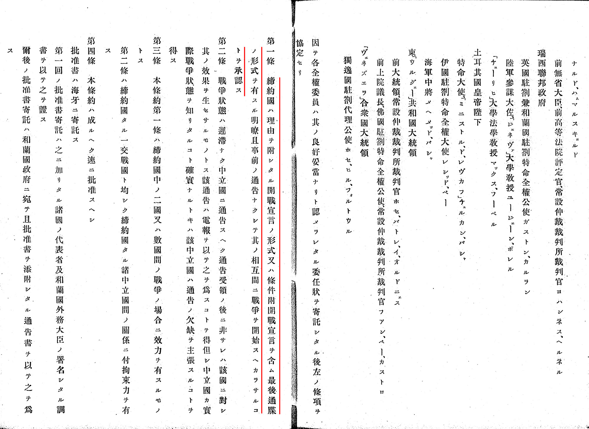 19世紀以後、国際社会の規模が広がるにつれ、一国と一国の間の約束事だけでなく、戦争や平和の際の世界的なルールを設ける必要が生じてきました。そうした約束事やルールの総称が「国際法」ですが、その中には旅行や貿易といった人や物の行き交いに関する決まり事、国と国の間の境目(国境)を明示した決まり事、さらには開戦・終戦の手続きや戦時中の行動を定めた決まり事があります。この決まり事は一般には「条約」と呼ばれます。条約で取り決められた約束に従う国は代表者を送り、その代表者は条約の書かれた正式の書類(条約正文)に署名を行います。これを「調印」と言います。ただし、調印に引き続いて、条約を結んだ国の政府がその署名を承認することで初めて条約は正式に認められます。これを「批准」と言います。