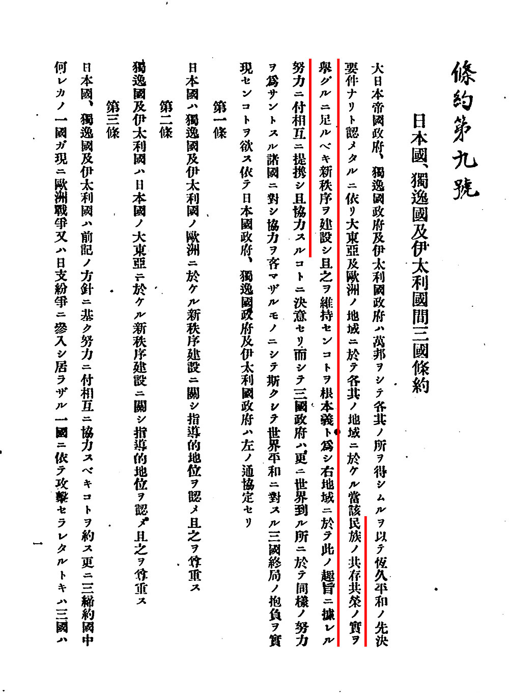 (15) は、第二次世界大戦中の昭和15年(1940年)、日本がドイツ、イタリアとの間に締結した「日独伊三国同盟条約」を示した文書です。当時のドイツとイタリアは連合国陣営と戦う一方で、ポーランドやベルギーなどヨーロッパ各国を武力で占領していましたが、この同盟条約の前文として「民族の共存共栄の実を挙ぐるに足るべき新秩序を建設し且之を維持せんことを根本義と為し右地域に於て此の趣旨に據れる努力に付相互に提携し且協力する」事が謳われています(原文カナ旧字)。この条約が調印された翌年、ドイツはソビエト連邦(今のロシア)を、日本はアメリカを攻撃しました。