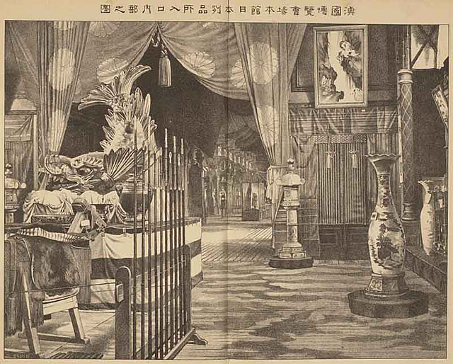 万国博覧会に最初に日本が登場したのは、1867年(慶応3年)のパリ万博です。しかし、この時は、幕府、薩摩藩、佐賀藩がそれぞれ独自に出品を行っただけで、まだ「日本」という国を紹介するとは言えないかたちでした。この後明治維新が進み、初めて明治政府、つまり日本の政府として正式に万国博覧会に参加したのが、この次の1873年(明治6年)のウィーン万博でした。 (1) は、この時の日本からの出品物の様子です。