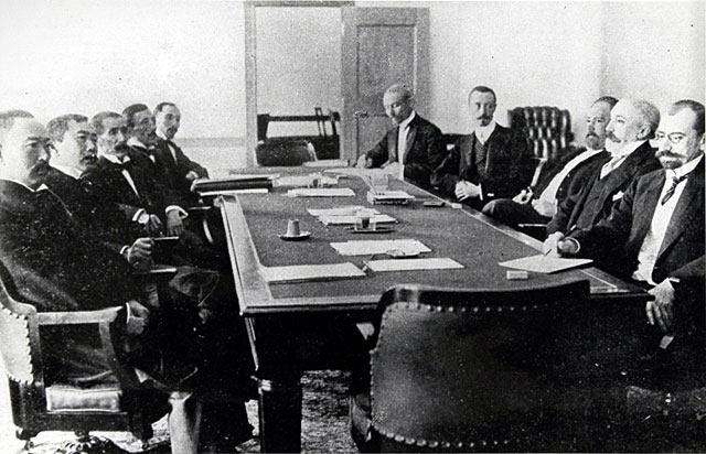 それが、明治38年(1905年)8月10日に始められた日露講和会議です (1) (2) (3) 。この会議はアメリカ合衆国ニューハンプシャー州のポーツマスという町の近郊で行われたので、ポーツマス講和会議とも呼ばれています。その結果、この年の9月5日に、日本とロシアの間で日露講和条約(ポーツマス条約)が結ばれ、18ヶ月間にわたって続いた日露戦争は終結しました。
