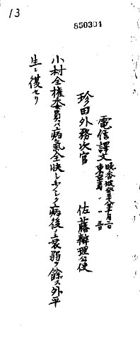 このような困難な交渉を日本側全権代表として担ってきた小村寿太郎は、苦労がたたったためか、講和条約締結の直後に発熱、腹痛を訴えました。 (6) は、9月10日に小村からアメリカのグラント将軍に対して出された電報です。この中で小村は、「昨夜から病気です」と述べ、翌日に予定されていたと思われる昼食会の辞退を申し出ています。 (7) は、9月13日午前に滞在地のニューヨークから本国に出された報告です。「ゴヲルブラッダア」(胆嚢)が炎症を起こしたために胃液が出ず、消化不良を起こしているという病状が記されています。 (8) は同じ日の午後に届けられた報告ですが、ここでは、夕方になって医師の診察を受けたところ、腸チフスの疑いがあるという診断結果であったと書かれています。