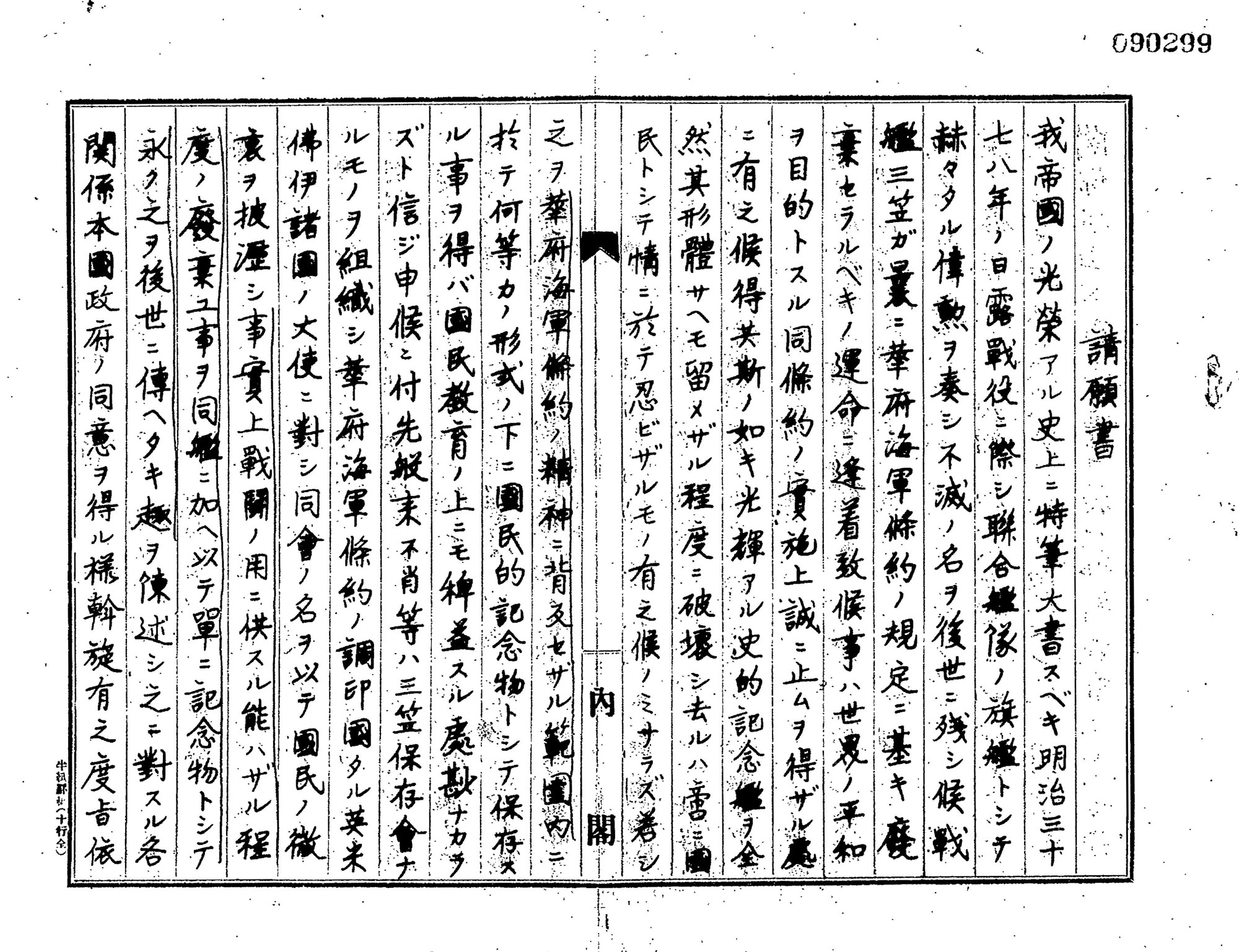 三笠は解体されることになっていましたが、この時、各地からその保存を求める声が起こりました。例えば (6) は、三重県度会郡大湊町長が外務大臣に出した陳情書の一部です。ここでは、日本海海戦で活躍した歴史的記念物として三笠は永遠に忘れることはできない、と述べられています。三笠保存運動は盛んなものとなり、「三笠保存会」が組織されました。 (7) は、保存会の会長が内閣総理大臣に出した請願書の一部で、各国政府と交渉して三笠を何らかのかたちで保存できるようにして欲しいと訴えられています。つまり、軍縮条約による制約を何とかしてかわし、三笠を解体せずに保存して欲しいという要望が、日本政府に寄せられていたわけです。
