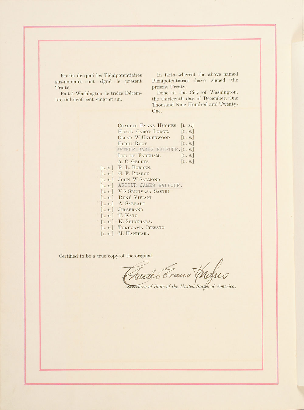 そもそも、この条約が検討された発端は、日英間で懸案となっていた日英同盟更新問題を処理するためでした。イギリスは当初、日英同盟の内容を実質的には変更せずに、アメリカを加えた「日英米三国協商」を提唱しましたが、これに対して幣原は、イギリス提案から軍事色を取り払い、何か問題が起きた際には関係国間で互いに協議するという試案を英米両国に提示しました。この「幣原試案」をもとに日本・イギリス・アメリカ・フランスの4か国で協議が進められ、 1921年12月13日に4か国代表が本条約に調印、日英同盟はこれに吸収される形で解消されました。 (3) はその条約書の一部です。