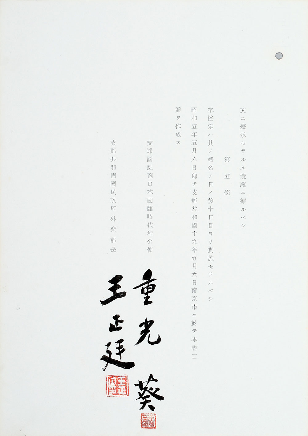 最初の懸案は中国の関税自主権承認問題でした。国民政府による北伐の完了後、アメリカ、イギリス、フランスなどの各国がこれを承認していたため、日中間の交渉のみが残されていました。幣原は、重光葵在上海総領事に臨時代理公使を兼任させ、この交渉にあたらせました。その結果、昭和5年(1930年)5月6日、条件付きで中国の関税自主権を認める「日華関税協定」が重光臨時代理公使と王正廷外交部長との間で調印されました。(8) はその条約書の一部です。