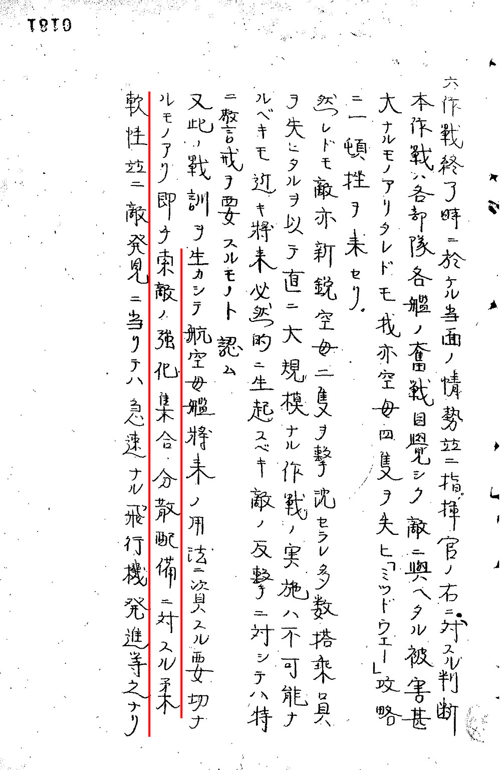 第一航空艦隊の戦闘詳報には、ミッドウェー海戦終了時における当面の情勢と指揮官のこれに対する判断という箇所があります。その中で、日本軍の戦果と被害について分析した上で、今後の作戦に当たっての索敵の強化・集合分散配備に対する柔軟性、急速なる飛行機発進の必要性等を述べています (9)。