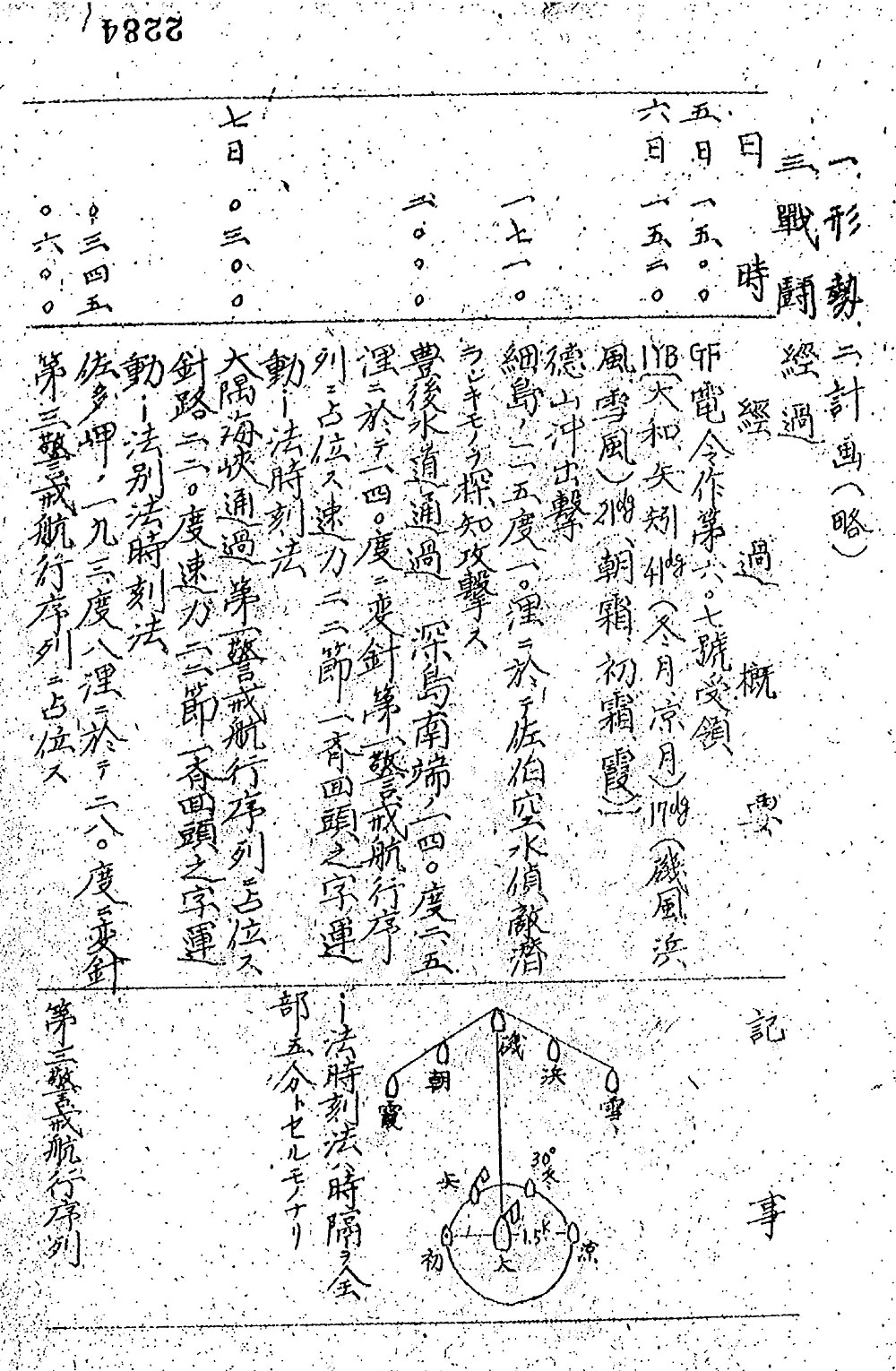 (5) のページ以下に、この時の大和の詳細な作戦行動が記されています。大和は4月6日15時20分に出撃します。出撃する艦艇は10隻、第二艦隊旗艦大和以下、軽巡洋艦矢矧、駆逐艦冬月・涼月・磯風・浜風・雪風・朝霜・霞・初霜。 (5) の下の「記事」には、その配置図が記されています。