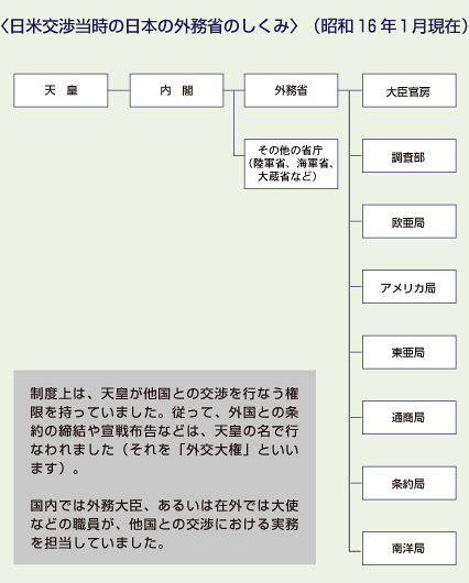 外務省とは、外国との交渉を担当する官庁のことです。その最高責任者を、外務大臣といいます。場合によっては、内閣総理大臣が、外務大臣の職務を担当することがあります。日米交渉の当時、アメリカとの交渉に関する事務処理を管轄したのは、外務省のアメリカ局(亜米利加局)という機関でした。外務省の職員の中には、外国との交渉のために国外に派遣される人々(大使・公使・領事など)がいます。昭和16年(1941年)2月にアメリカに着任した日本の代表は、「特命全権大使」の肩書きを持った、野村吉三郎という人物でした。