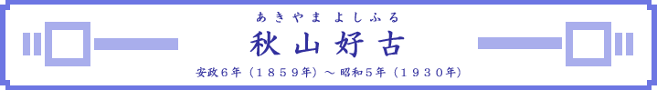 享年71歳。 秋山好古に関する資料は、当アジア歴史資料センターに多数収録されています。 具体的に資料を探しだす方法は、以下のとおりです。 1.「検索メニュー」画面に進んで、「キーワード検索」をクリックします (あるいは「キーワード詳細検索」でもけっこうです)。 2.「キーワード検索」画面のキーワードに「秋山好古」と入力して 「検索」ボタンを押します(「キーワード詳細検索」も同様です)。 この方法で「秋山好古」をキーワードにして検索すると、115件の資料が一覧表示されます。 また「秋山大佐」「秋山少将」などをキーワードとして入力したり、年代を特定して検索していただくと、さらに多くの資料の閲覧ができます。 |