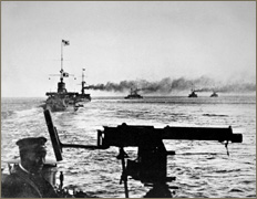 翌10日の朝、ついにウィトゲフト少将率いる旅順艦隊は、大挙してウラジオストックへ向けて旅順港を脱出しようとします。旅順艦隊出港の報告を受けた東郷平八郎は速やかに全戦隊を各配備につかせました(関連資料3)。正午頃、第一戦隊は黄海沖の遇岩の南方において西南西に向かいましたが、旅順艦隊はすでに遇岩の西北西約10浬まで進んでいました。なるべく敵艦隊を外洋に誘致させようとする第一戦隊に対し、旅順艦隊は南東に向かって逃れようとしました。しかし、両者の間は徐々に縮まっていきます。午後1時15分、日本側より遠距離射撃を開始し、ロシア側もこれに応戦しました。第一次合戦の始まりです。