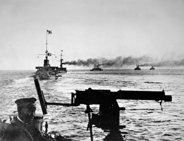 旗艦「ツエザレウィチ」が被弾して舵を損傷。ロシア艦隊が混乱に陥る。