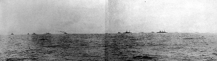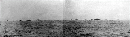 ▲日本海海戦後に降伏したネボガトフ少将率いる第三戦艦隊と これを誘導する日本艦隊主力部隊(防衛省防衛研究所所蔵) |