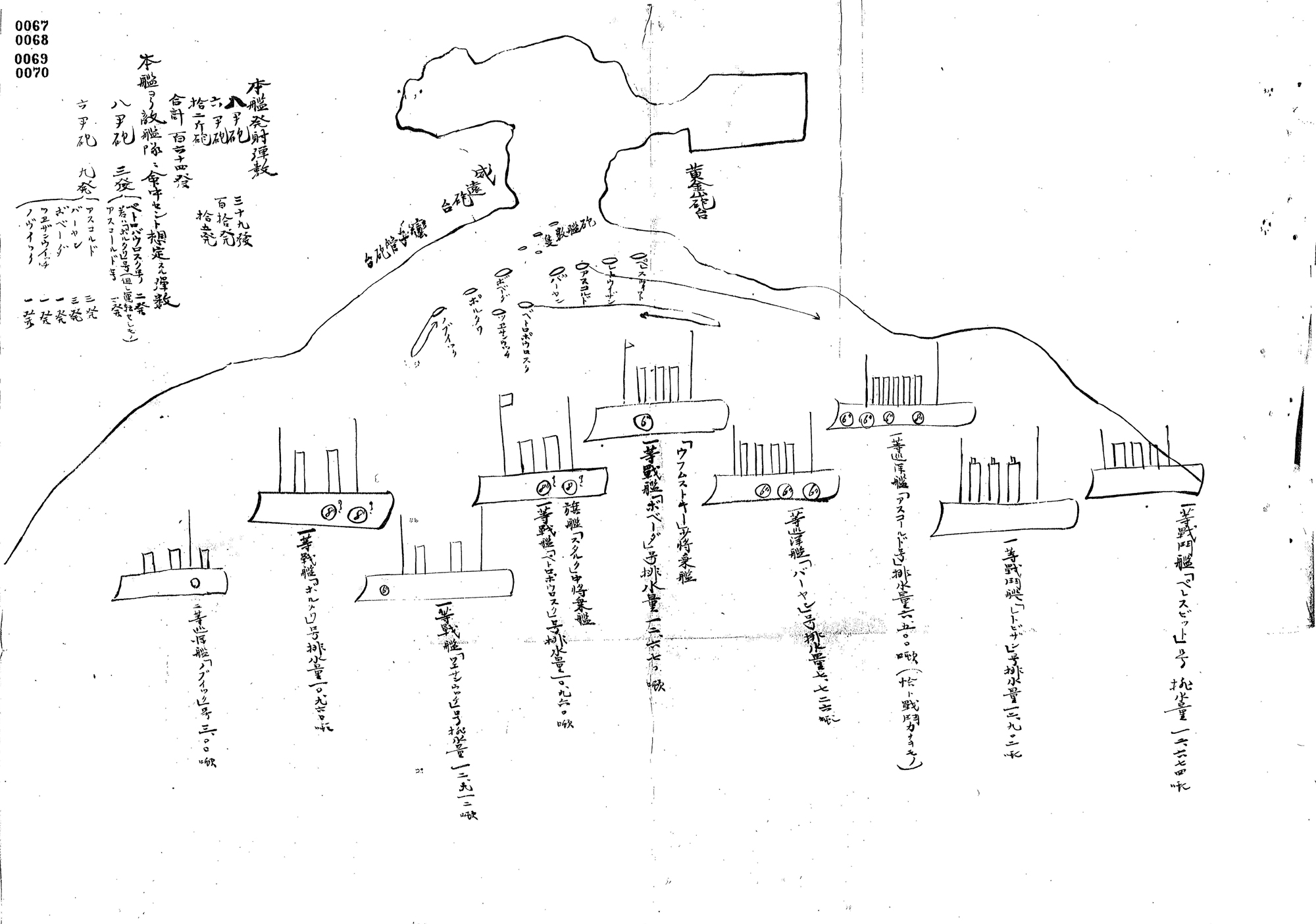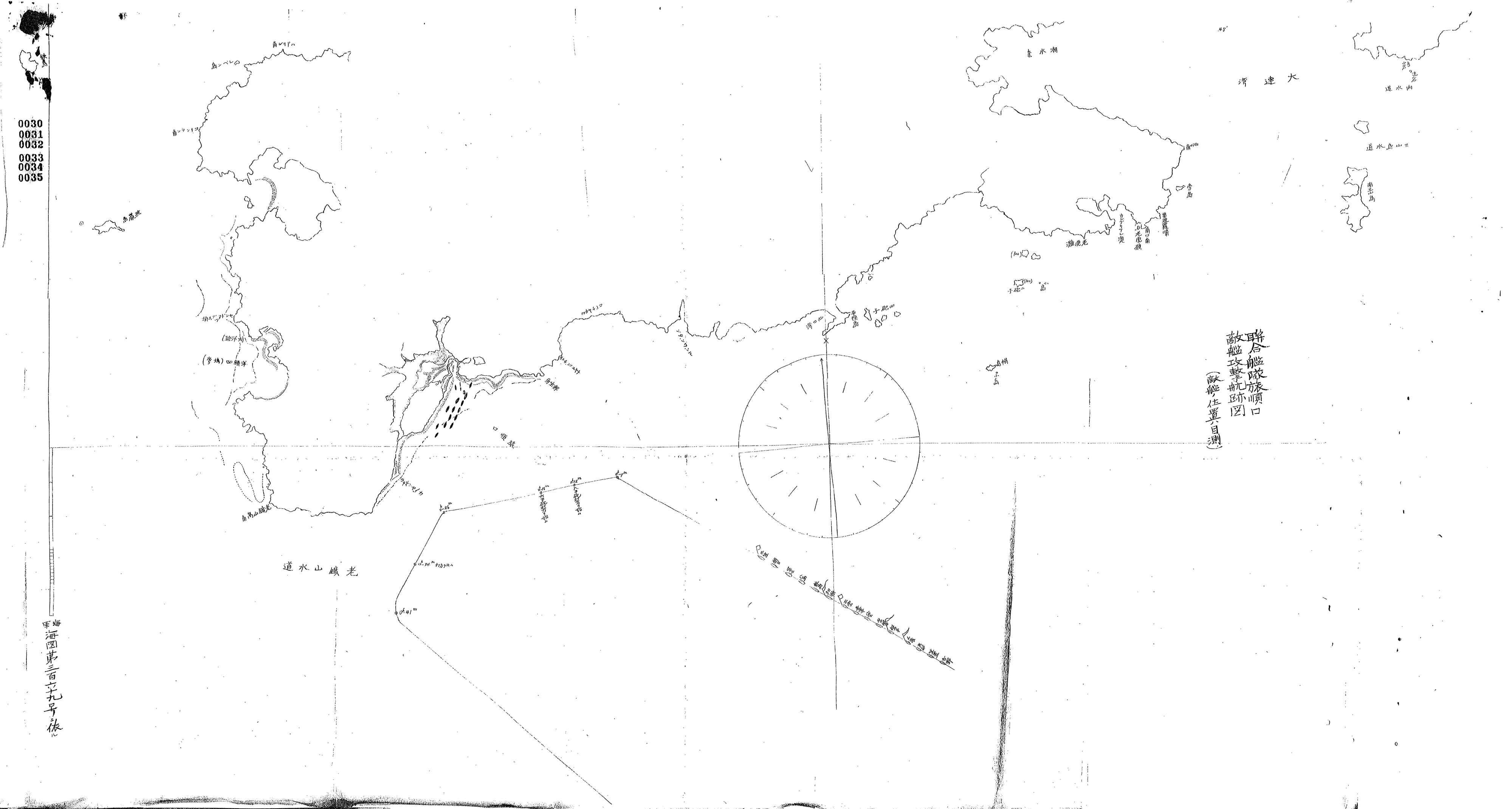 20画像目は、この時の攻撃目標であった旅順口外のロシア艦隊の配置図で、艦船名の明らかでないものについては「高キ三煙突ヲ有スル戦艦」(高い3本の煙突のある戦艦)、「不明」などと記され、一部に戦闘の結果(「大火災」等)も付記されています。29~34画像目は、第二艦隊旗艦「出雲」の伊地知艦長から上村長官に提出された(日付不明)この艦の戦闘詳報に付されている、「連合艦隊旅順口敵艦攻撃航跡図」と題された航跡図で、第一艦隊の「三笠」(旗艦)、「朝日」、「冨士」、第二艦隊の「出雲」(旗艦)、「吾妻」「八雲」など、日本艦隊の艦船の並び順が記されていますが、ロシア艦隊の配置については「敵艦ノ位置ハ目測」とされています。
