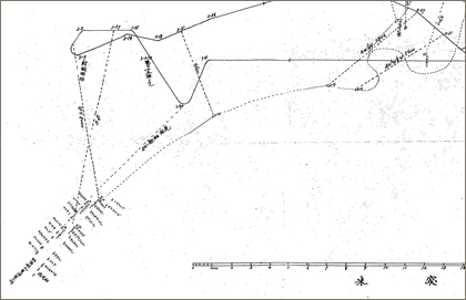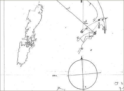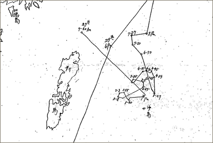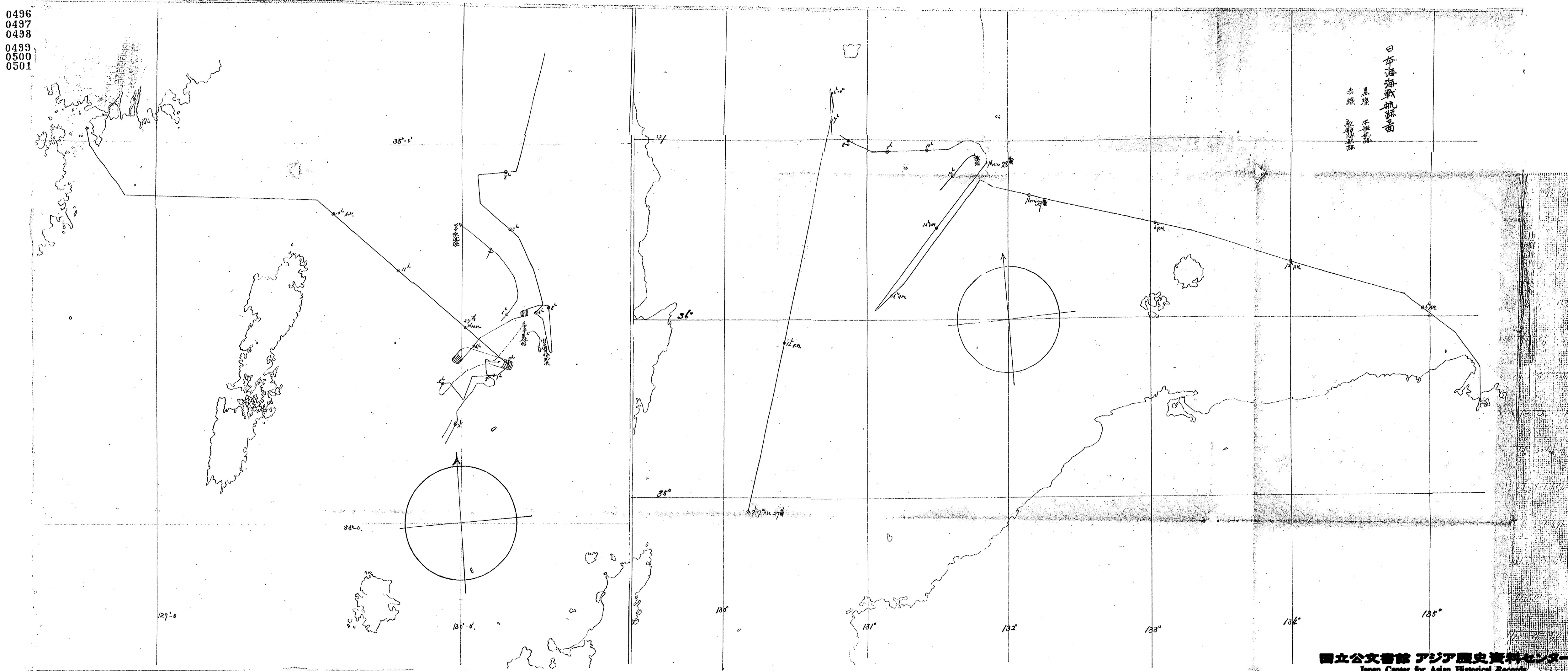 【資料8】の10~17画像目は、第一戦隊に所属した戦艦「敷島」の戦闘詳報に付されている、上のものと同様の、戦闘の推移に従って日露両艦隊の位置関係を示した略図です。10画像目の図は、「廿(二十)七日午后(後)二時廿(二十)分頃 関係位置」と題されており、一般に「T字戦法」あるいは「丁字戦法」と呼ばれる日本艦隊の動きが示されています。19~24画像目は、「日本海海戦航跡図」と題された図で、左右2つの図に分かれています。左図(19、22画像目)は、加徳水道(朝鮮半島南東部)を出撃し、27日午後に対馬沖でバルチック艦隊と交戦し、やがて夜間の戦闘へと移っていくまでの航跡が示されています。