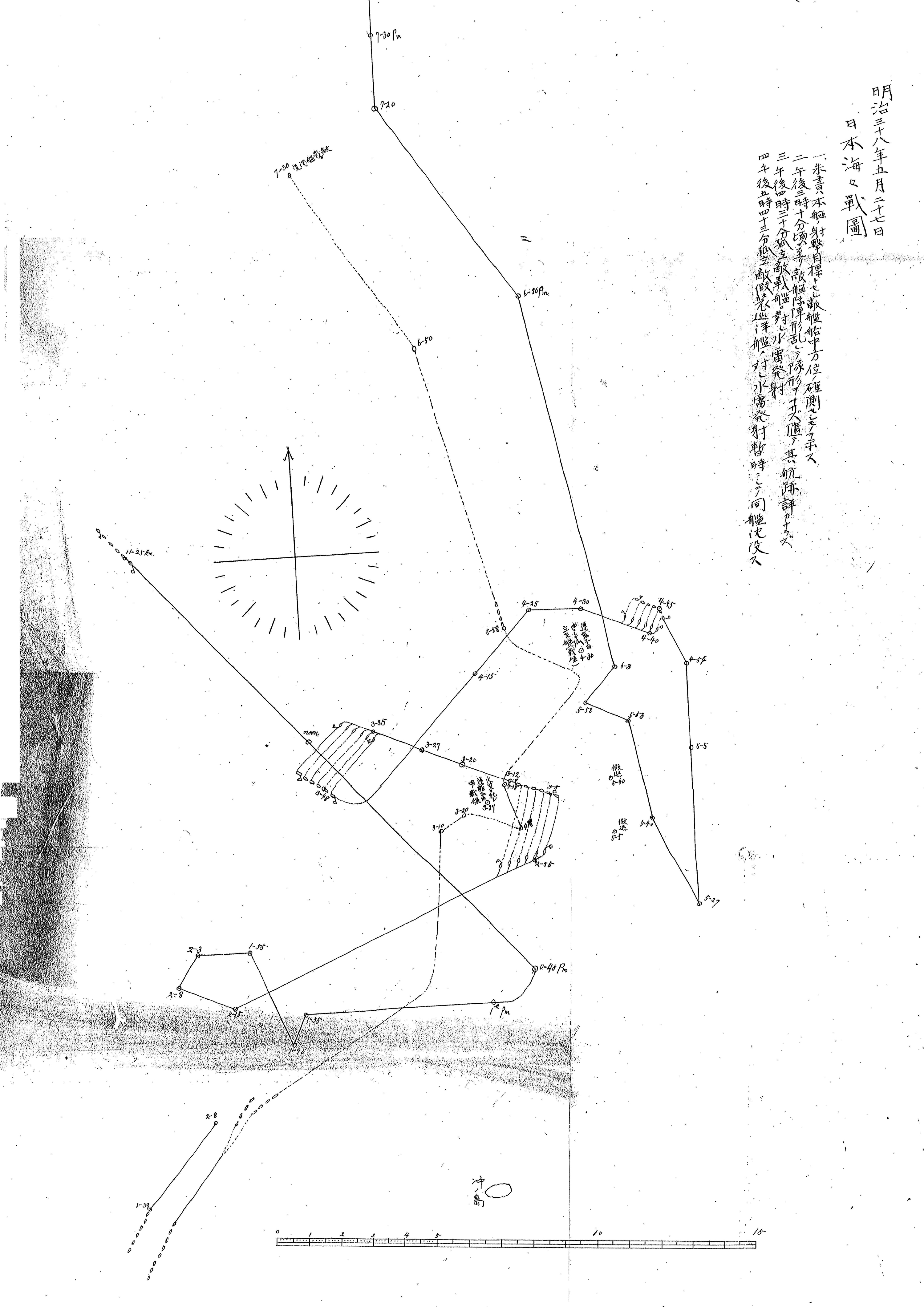 【資料6】の14、18、20、21、24、26画像目、【資料7】の3、7画像目では、それぞれ5月27日と28日の戦闘の推移についての詳細な報告文の合間に、各局面での日本艦隊とロシア艦隊の位置関係を示す略図が挿入されています。