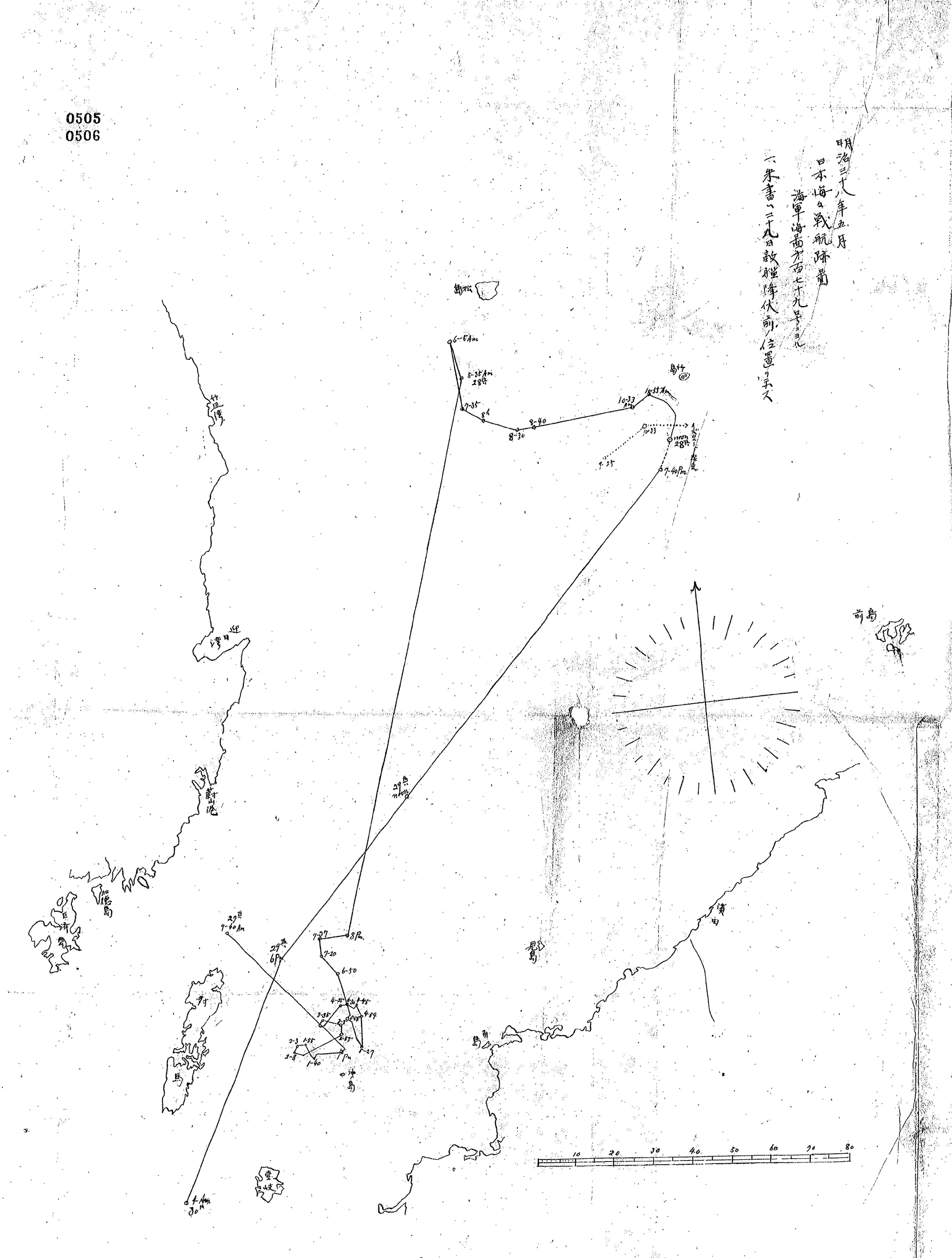 26~28画像目は、「明治三十八年五月二十七日 日本海々戦図」と題された図で、上の「日本海海戦航跡図」の左図(19、22画像目)の右側中央部分にあたる内容です(異なる点もあります)。ここには27日日中の戦闘の際の日露両艦隊の動きが示されています。南方(図の下方)から北上してきているのがロシアのバルチック艦隊です。図下方(28画像目)の中央辺りで円のような形を描いている日本艦隊の動きが、「T字戦法(丁字戦法)」と呼ばれているものです。30~31画像目は、「明治三十八年五月 日本海々戦航跡図」と題された図で、上の「日本海海戦航跡図」の右図と左図をあわせたような内容ですが、28日の戦闘以降の航跡は、舞鶴への帰港ではなく再び対馬方面への南下となっています。