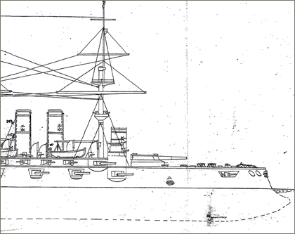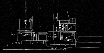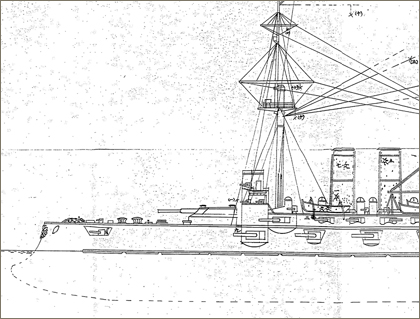 【資料20】~【資料21】は、連合艦隊第一艦隊、あるいはそれらの旗艦を務めた戦艦「三笠」の戦闘記録です。こうした記録は、基本的に戦闘ごとに時系列的に経緯を整理し、これに被害や消耗品のデータを加えたつくりとなっていますが、この中には、上で見たような航跡図とともに、その戦闘で傷ついた艦船の略図やある程度詳細な図面が付されている場合があります。