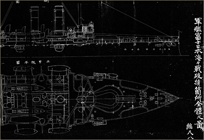 【資料22】は、日本海海戦に参加した日本艦隊の艦船の破損の状況を示した図面を集めたものです。3~18画像目は、「軍艦富士日本海々戦破損箇所全体之図」と題された図面で、戦艦「三笠」と同じ連合艦隊第一艦隊の第一戦隊に所属し日本海海戦に参加した戦艦「富士」の艦体の図面に、戦闘後の破損箇所が書き込まれたものです。25~28画像目は、同艦の艦橋付近の破損箇所を拡大して詳しく描いた図面です。