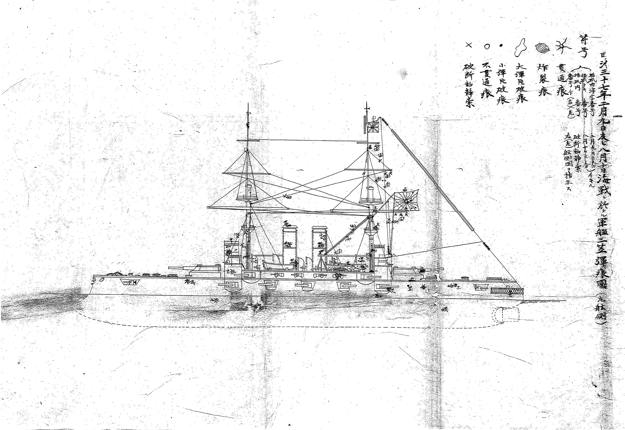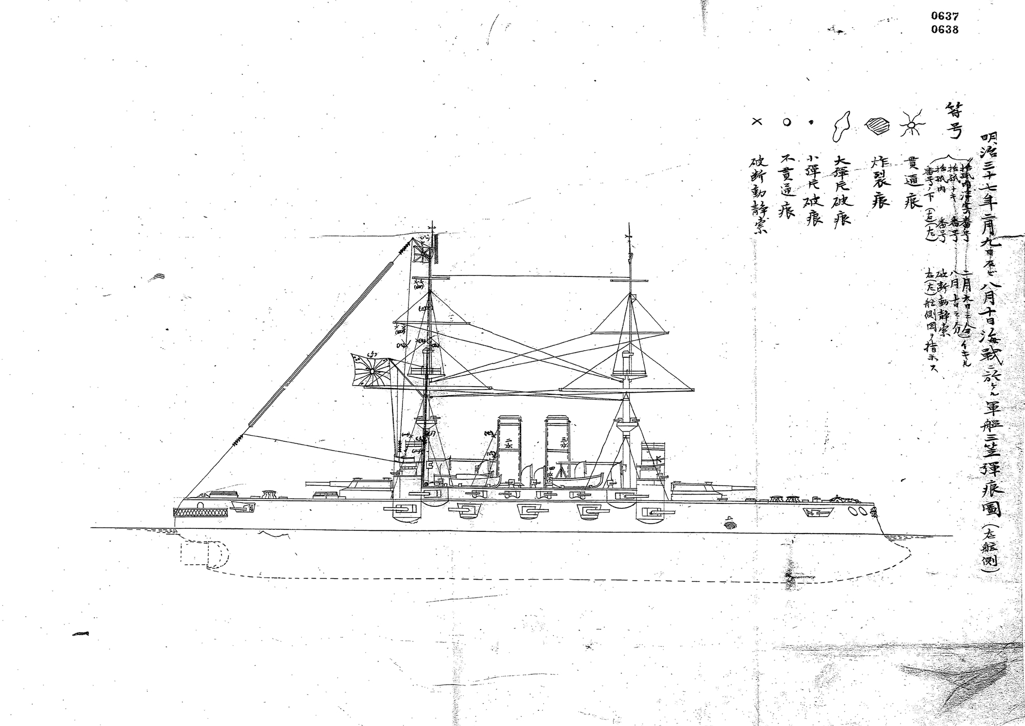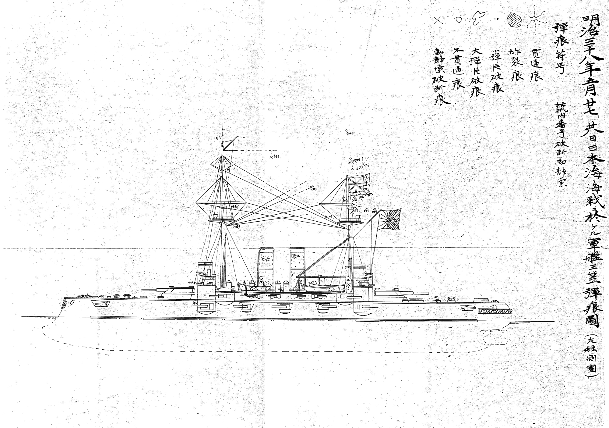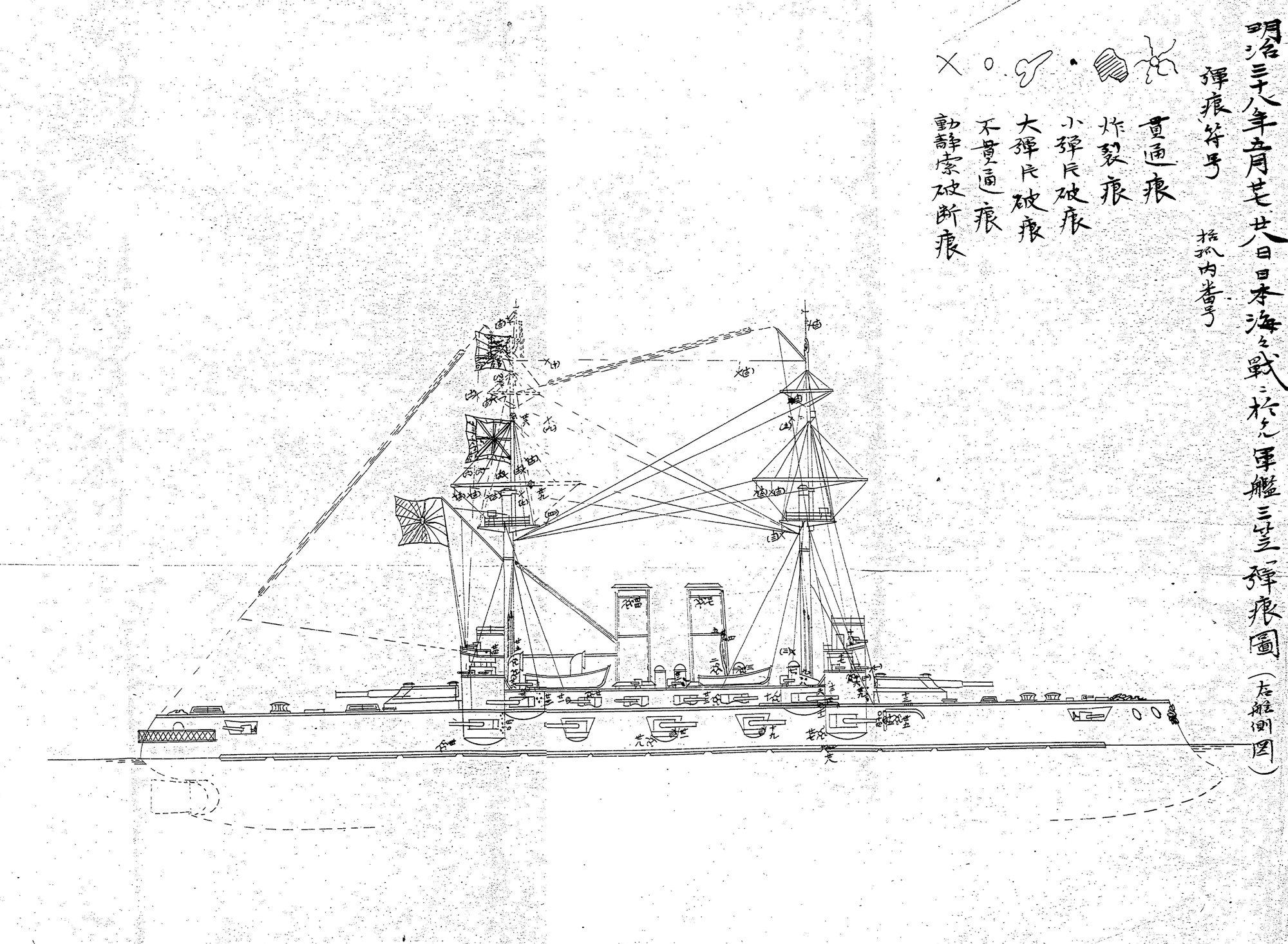 【資料20】の4~5画像目は、第一艦隊の戦闘詳報に付されている、「明治三十七年二月九日及ビ八月十日海戦ニ於ケル軍艦三笠弾痕図(右舷側)」(ただし「二月九日及ビ」の箇所には抹消線が入れられているようにも見えます)と題された図で、明治37年(1904年)2月9日の旅順港攻撃及び8月10日の黄海海戦が終了した時点での、連合艦隊旗艦兼第一艦隊旗艦の戦艦「三笠」の破損箇所を、艦体の右側(右舷)から見た様子が描かれています。 11~12画像目は、同じく左側(左舷)から見た様子が描かれた図面です。これらの図面では、砲弾や弾丸が艦の装甲を貫いてできた「貫通痕」、砲弾が炸裂してできた「炸裂痕」、大小の砲弾の破片が当たってできた「小弾片破痕」「大弾片破痕」、砲弾や弾丸が当たりながら貫かずに跳ね返ったことによってできた「不貫通痕」、動索(帆の操作などのために動かすロープ)や静索(マストを固定しておくロープ)が千切れてしまった「破断動静索」が示されています。