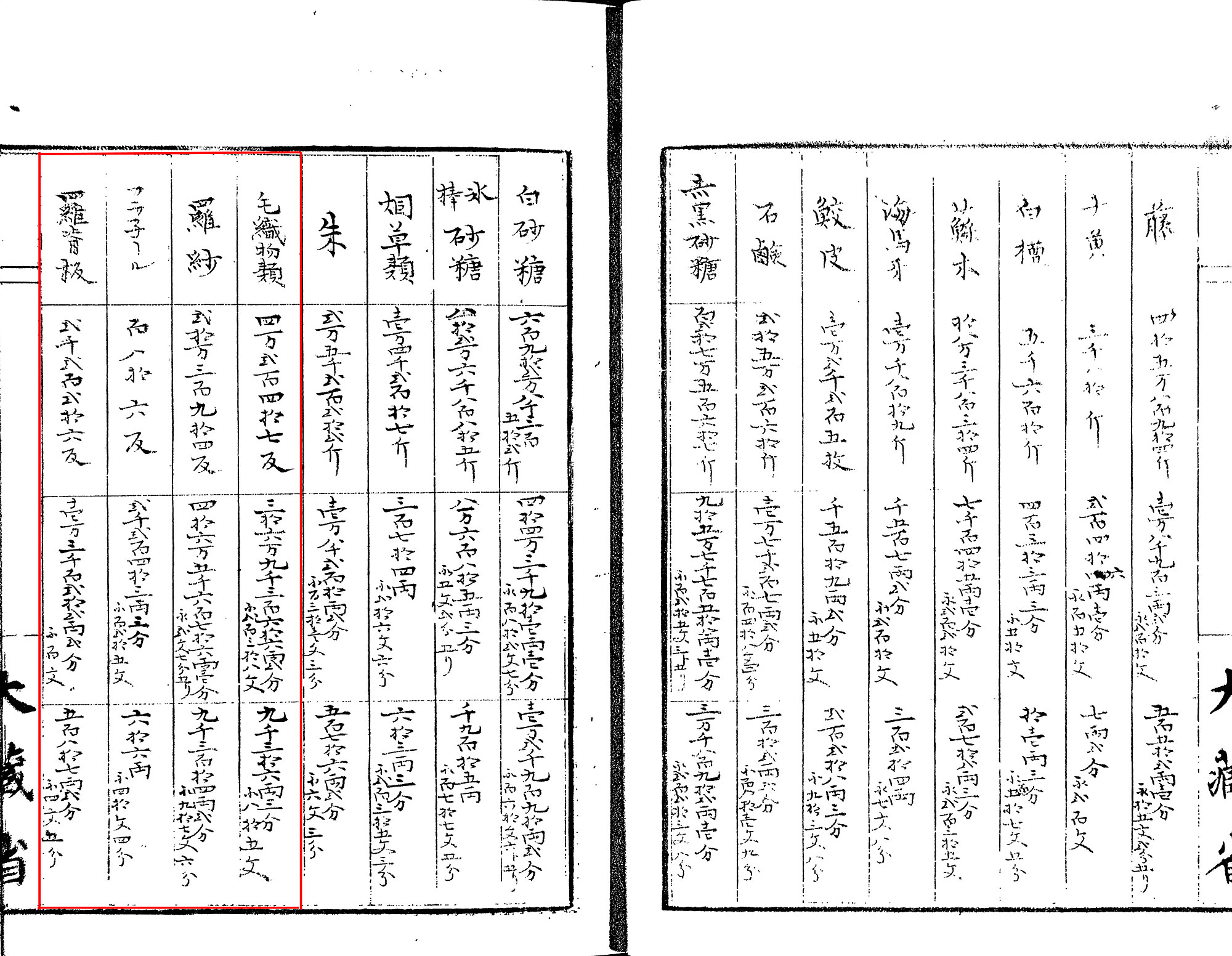 洋服は当時はとても高価なぜいたく品だったので、これに手の届かない庶民はそれまで通りに和服を着ていました。ちなみに、「和服」という言葉は、「洋服」が日本に入ってきた時に、これに対する言葉として作られたものです。裕福な町人は、高価な絹織物や毛織物などを服地にした和服を着ましたが、農民は主に綿織物を服地とした簡素な和服を着ていました。しかし、この庶民の和服も、その服地となる織物は幕末維新期にダイナミックに変化していました。開港後、西欧製品の参入によって、モスリンや金巾のような輸入織物が和装ファッションに浸透して、庶民にも多様な用途において用いられるようになっていました。 (9)、(10)、(11) は、明治2年度(旧暦)に日本の各港で輸入された物品を示した表です。ここからは、いろいろな織物が輸入されていたことがわかります。(9)は綿織物類、(10)は麻織物類、(11)は毛織物の輸入数量をそれぞれ示しています。