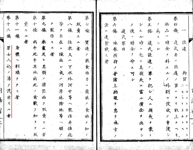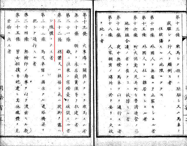 当時の人々は、このような和服をどのように着ていたのでしょうか。現代人にとって、和服はとても窮屈なイメージがありますが、実は昔の人達も同じだったようです。日本人は、和服を軽くひっかけるようにして着ていました。すると、当然、着物がはだけてしまいます。このような姿について、ペリーに随行した宣教師のサミュエル・ウェルズ・ウィリアムは、「婦人達は胸を隠そうとはしないし、歩くたびに太腿まで覗かせる。男は男で、前をほんの半端なぼろで隠しただけで出歩き・・・」というように半ば蔑むように語っています。このような「裸体」の風俗は、日本人にとっては極めて普通のことでしたが、初めてこれを目にした西洋人達はとても驚きました。このような「文明」の視線に対し、日本を野蛮と思われるのを嫌った明治政府は、「裸体」の風俗を取り締まるようになります。明治元年、横浜を皮切りに、続いて明治4年に東京でも裸体禁止令が出され、その後、全国に普及していきました。その流れの中で、裸体や混浴を禁止する「違式詿違条例」が明治5年に東京で出され、その後、各地で風俗の取締りが行われるようになりました。 (12)、(13) は、明治5年に東京府で出された違式詿違条例です。 (12) は混浴の禁止、(13)は裸体を禁止する条例を示しています。このように、庶民にとっての文明開化は、風俗の取り締りへの対応という経験でもありました。