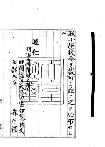 教育の義務という言葉が初めて登場するのは明治19年(1886年)、勅令として出された「小学校令」 (3) においてです。この後戦前期を通して修業年限は異なるものの、3~6年制の小学校(尋常小学校)が義務教育課程となりました。