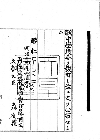 日本最初の近代学校制度は明治6年(1873年)に、フランスを模範とする中央集権的な「学制」として定められます。「学制」では学校制度が大学・中学・小学の三段階と定められ、国民に教育の機会が開かれました。(2) は「学制」の序文です。ここには「人々自ら其身を立て其産を治め其業を昌にして以て其生を遂るゆゑんのものは他なし。身を脩め智を開き才藝を長するによるなり。而て其身を脩め智を開き才藝を長するは學にあらされは能はす。是れ學校の設あるゆゑん(道徳を身につけ、能力を引き出し伸ばすことを学び、立身出世を可能にするのが学校である)」と明示されています。また、小学校は「人民一般必す学はすんはあるへからさるものとす(国民は必ず学ばなければならないこととする)」と就学義務のある8年制の学校(下等小学校4年、上等小学校4年)として規定されました。しかしながら、授業料や学校の建設・維持費などは教育を受ける主体、つまり国民が負担することとされており、負担に耐えかねた人々の中からは学制反対一揆が起こることもありました。
