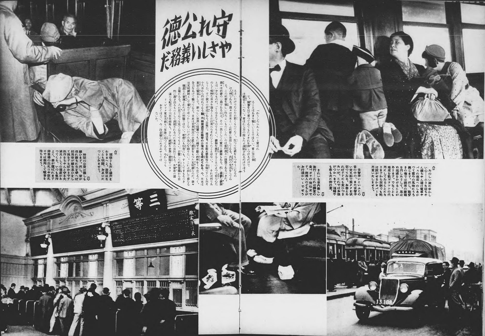 (3) と (4) は、「守れ公徳 やさしい義務だ」と題された特集記事です。これは、現代風に言ってみれば「公共マナーを守ろう」という内容です。バスや汽車の座席に靴で上がらない、汽車の中ではちゃんと弁当の後始末をする、食堂車のテーブルには長く居座らない、といった呼びかけがされています。こうしたところは現代と少しも変わりません。