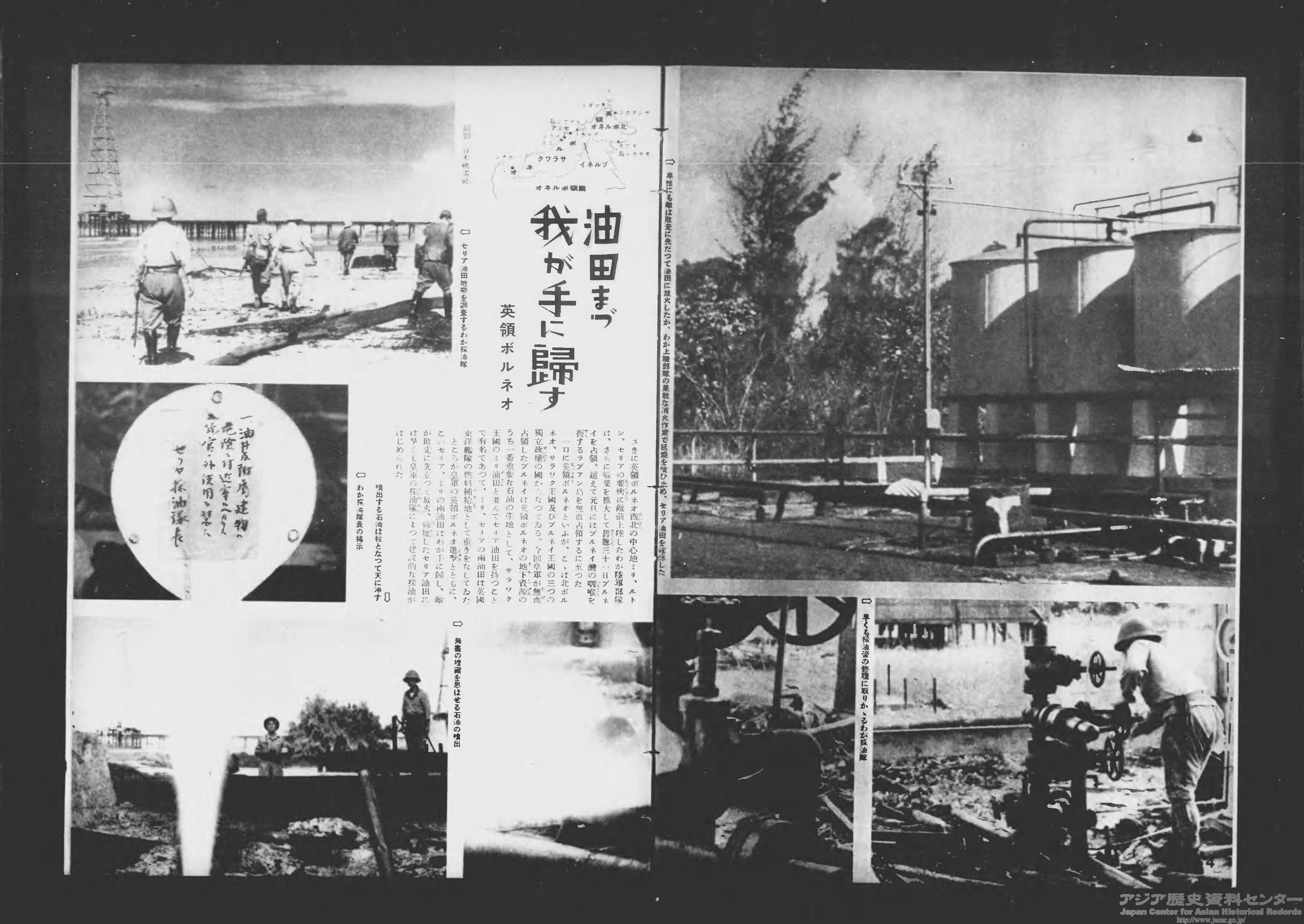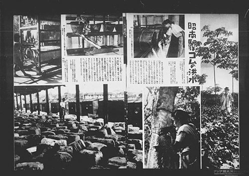 左の画像は、英領ボルネオの油田地帯についての記事「油田まづ我が手に帰す」(203号、1942年1月14日)。247号(1942年11月18日)には、右の画像の記事「昭南駅はゴムの洪水」のほか、ラングーンの街頭風景、マニラの国民学校、サイゴンの日本語講習など、占領地の状況が写真とともに報じられています。