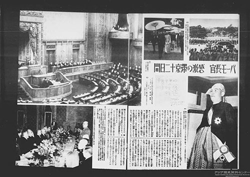 1943年3月、ビルマのバー・モウ長官が来日し、ビルマ独立について協議しました。『写真週報』3月31号は表紙で、4月7日号では誌面でこれを報じています。
