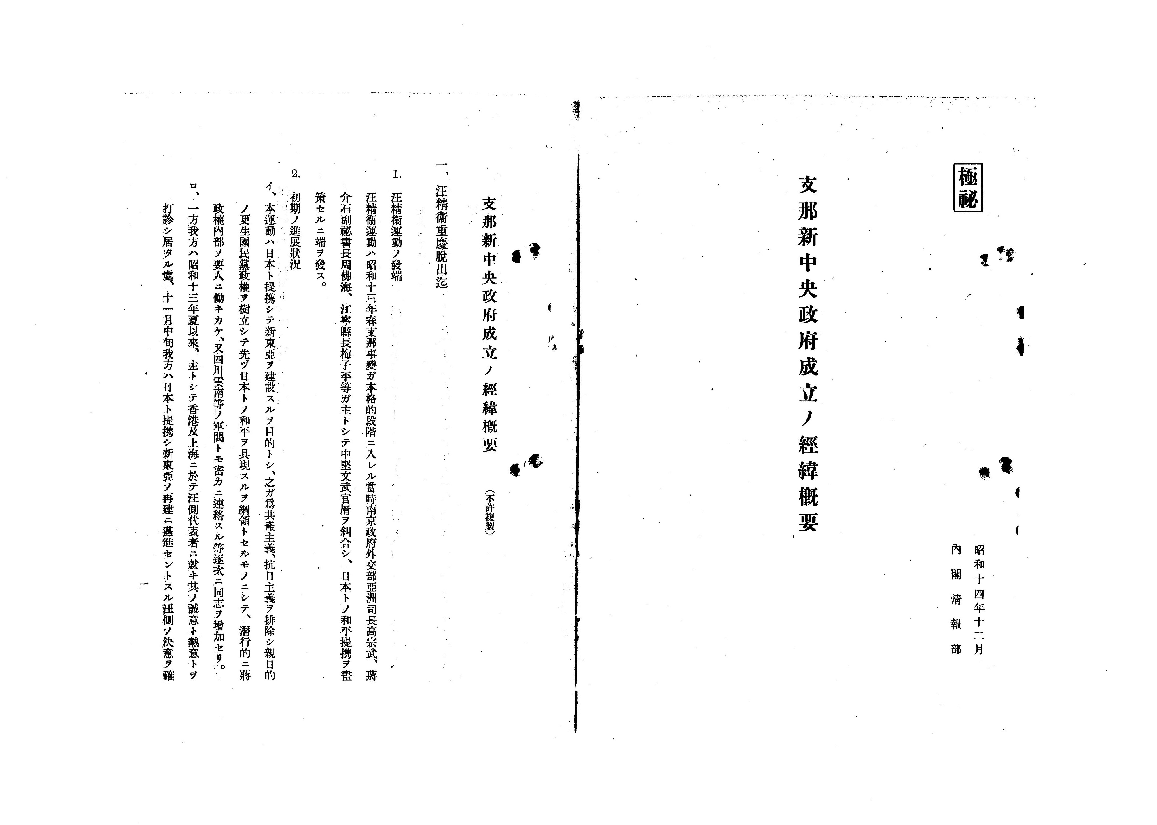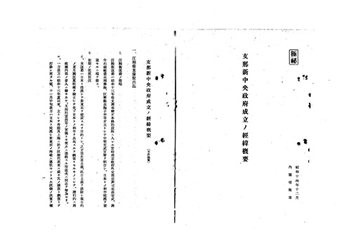 国民政府の有力政治家・汪兆銘(汪精衛)は日本との妥協・和平を図り、1938年12月に重慶を脱出し、新政権樹立の準備を進めていくこととなります。この資料は、後になってその経緯をまとめた内閣情報部作成の資料です(画像は表紙と冒頭箇所)。