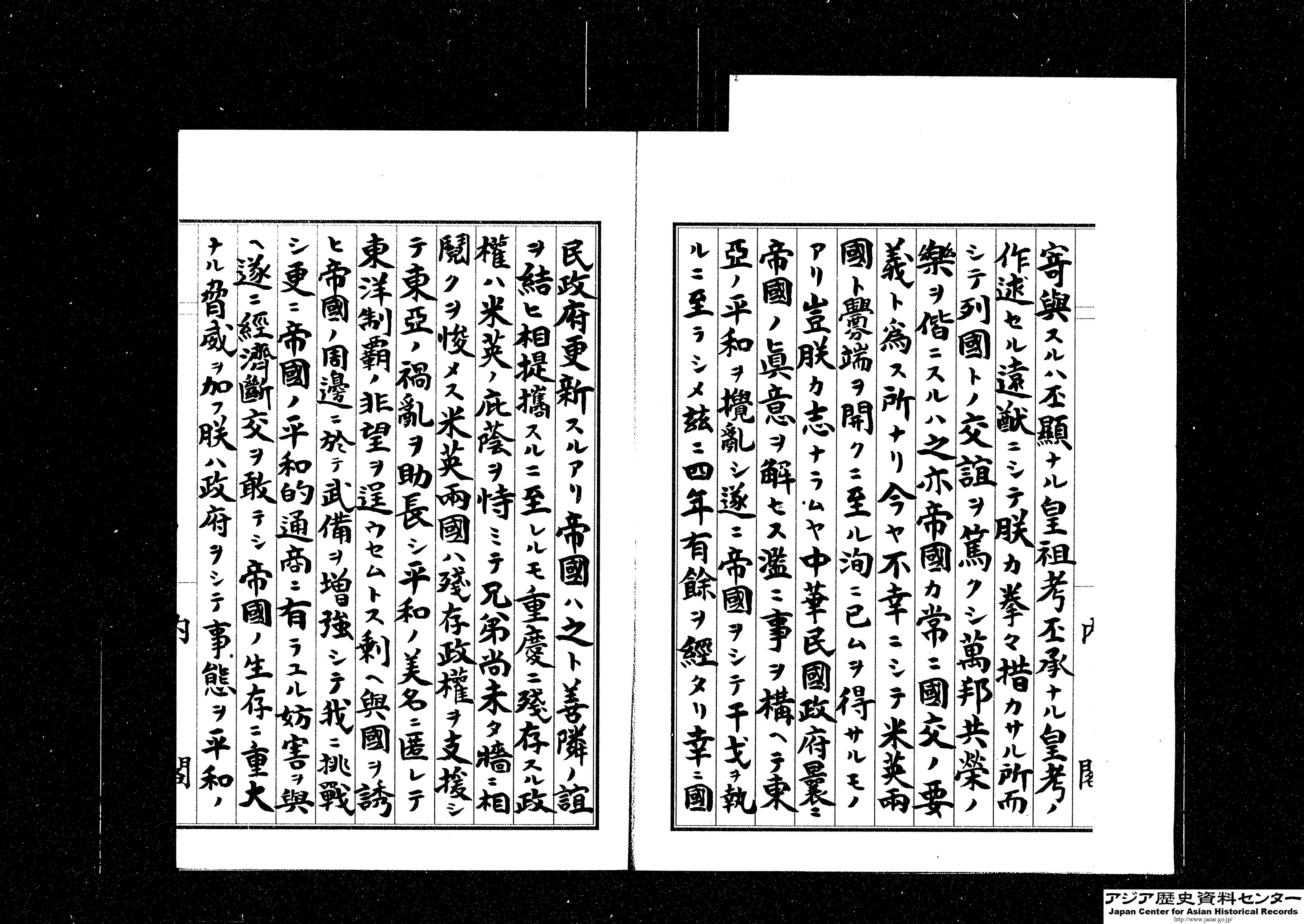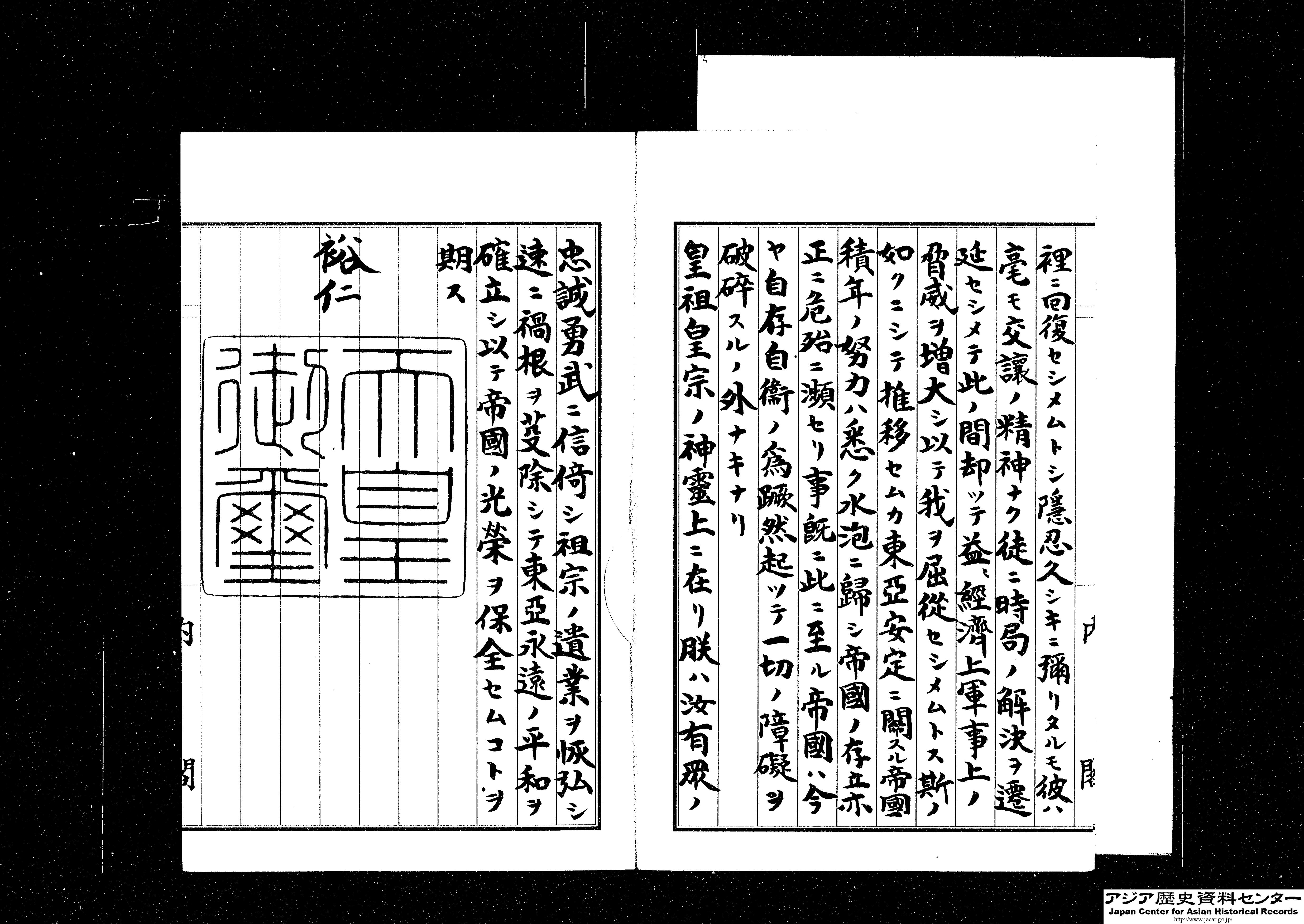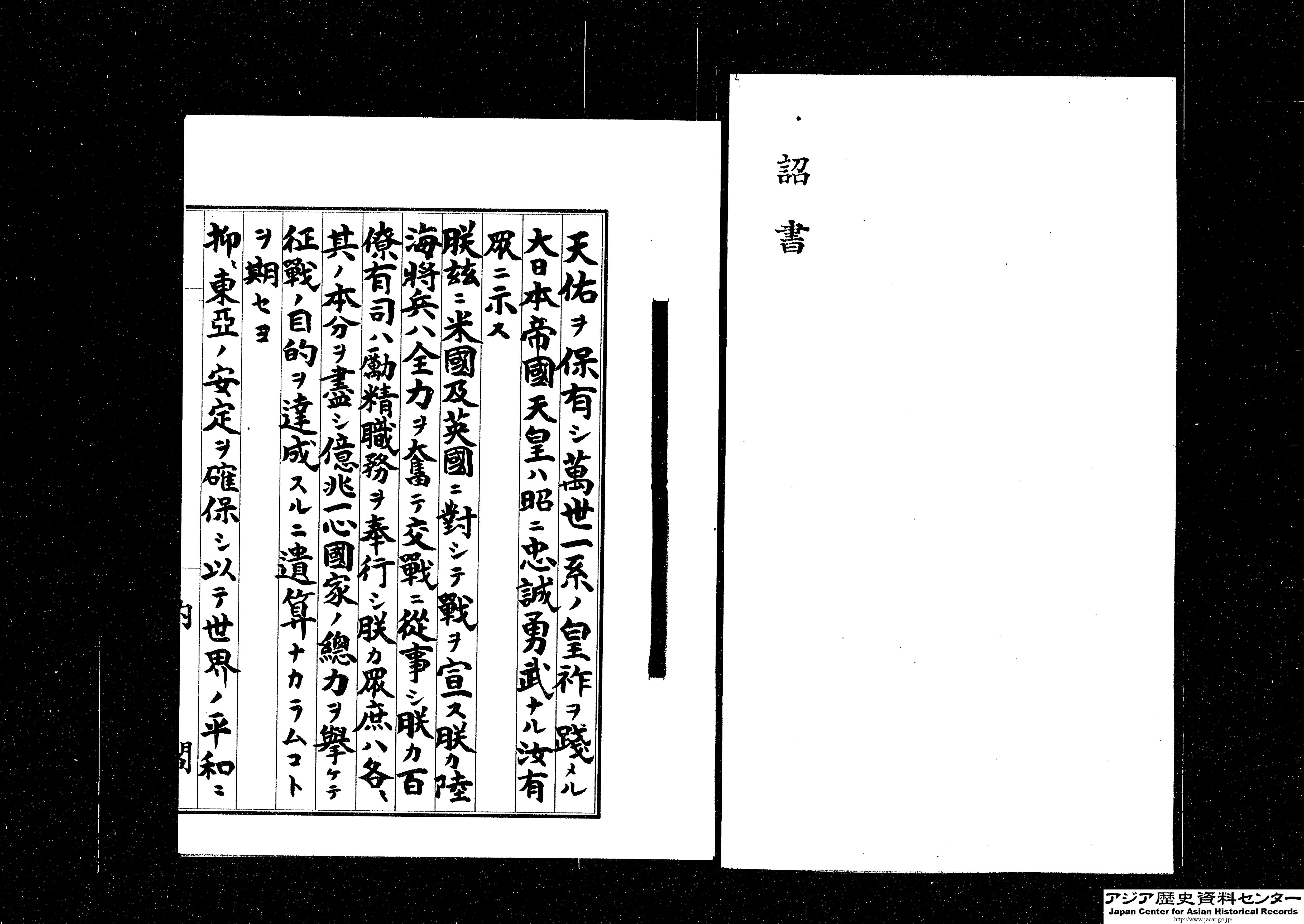 「御署名原本・昭和二十年・詔書八月十四日・大東亜戦争終結ニ関スル詔書」(Ref. A04017702300)1~4画像目
